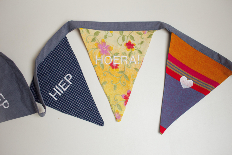 Breng een feestelijke sfeer in huis of tuin met deze duurzame vlaggenlijn, handgemaakt van reststoffen. Elke slinger is uniek – geen twee zijn hetzelfde!